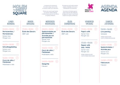 Vous trouverez ci-dessous le planning d'une semaine type à Molenwest Square. Bien sur, des évenements ponctuels ponctuels peuvent se rajouter et certaines plages horaires sont libres donc n'hésitez pas à nous contacter si vous voulez organiser d'autres activités sur le site, pour le quartier, par le quartier !